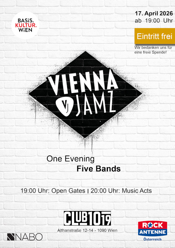 Beim "Vienna Jamz"-Abend im April sind wieder fünf Bands am Start: Itachi Riot, Bad Decision, Patchrock, Jukebox und Schubi Two spielen J-Rock, Rock, Blues, Austropop und Mundartsongs - Eigenes & Gecovertes.