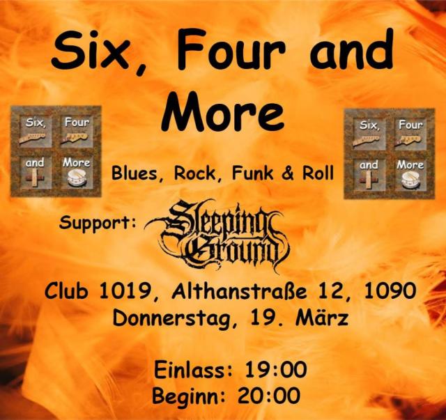 Seit 3 Jahrzehnten spielen Six, Four and More ihre Eigenkompositionen im Stile von Blues, Rock, Funk & Roll. Der Abend wird ein Hitmix aus neues Songs und Klassikern ihrer Debüt-CD "In The Groove". Eröffnet wird der Abend von Sleeping Ground, die ihr Livedebüt feiern.